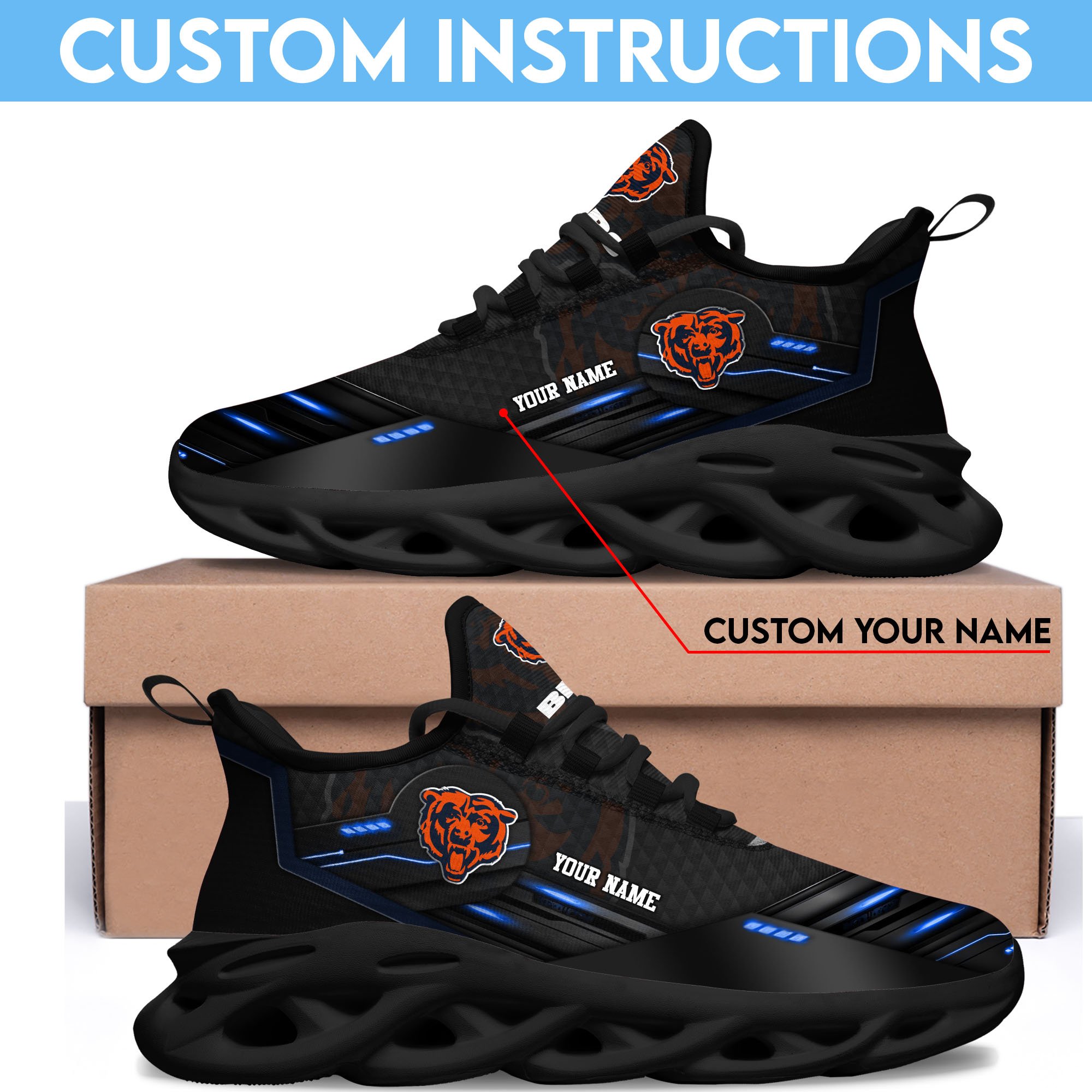 Chicago Bears Black Clunky Sneaker Custom Name, Max Soul Shoes, Sport Gifts For Fan