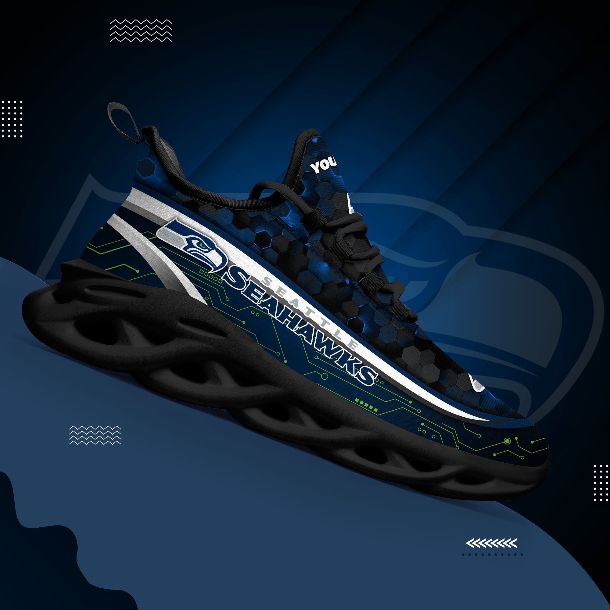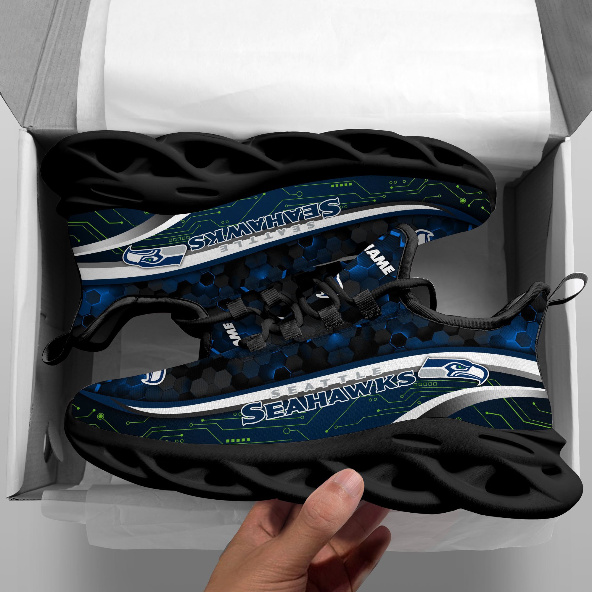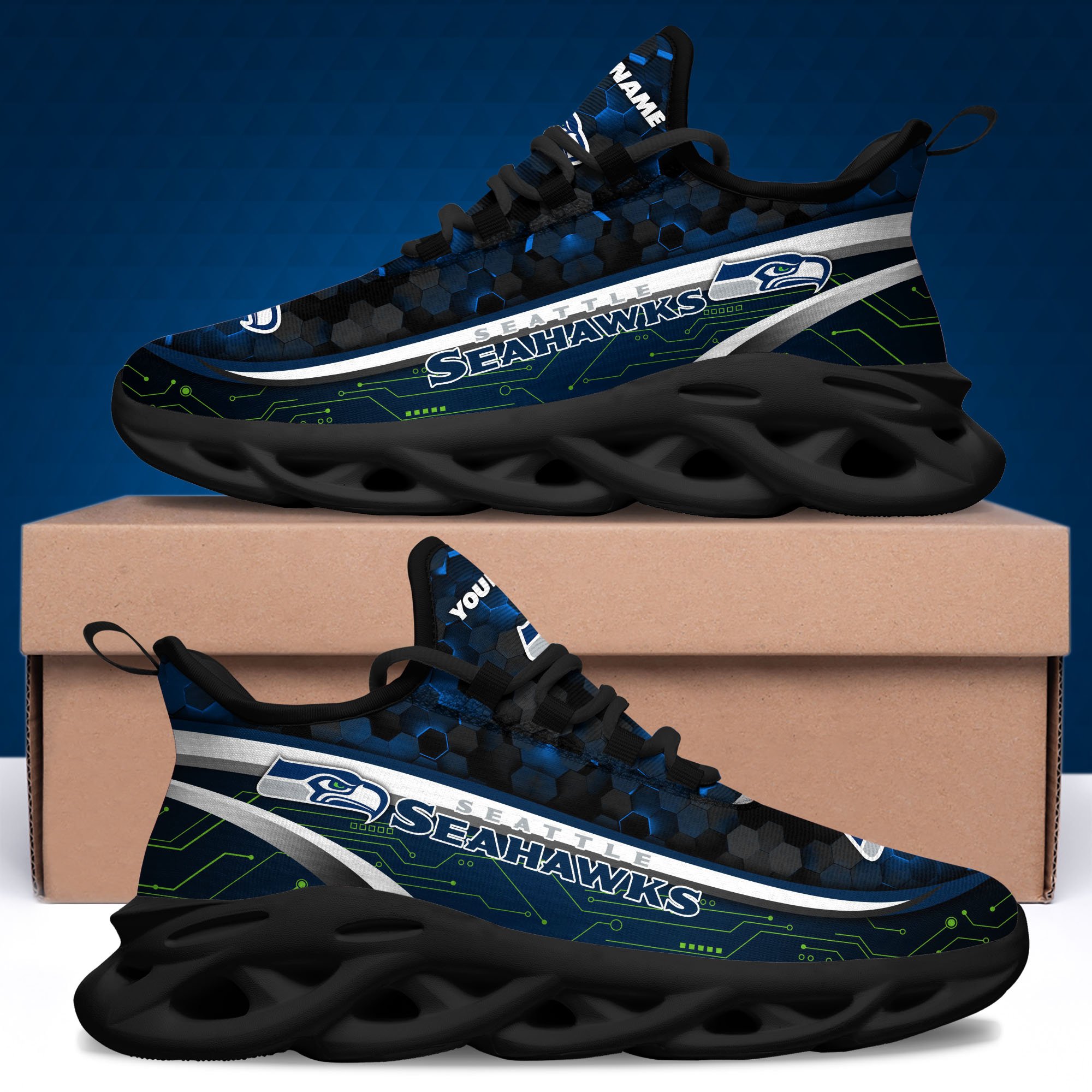 Seattle Seahawks Black Clunky Sneakers Custom Name, Max Soul Shoes, Sport Gifts